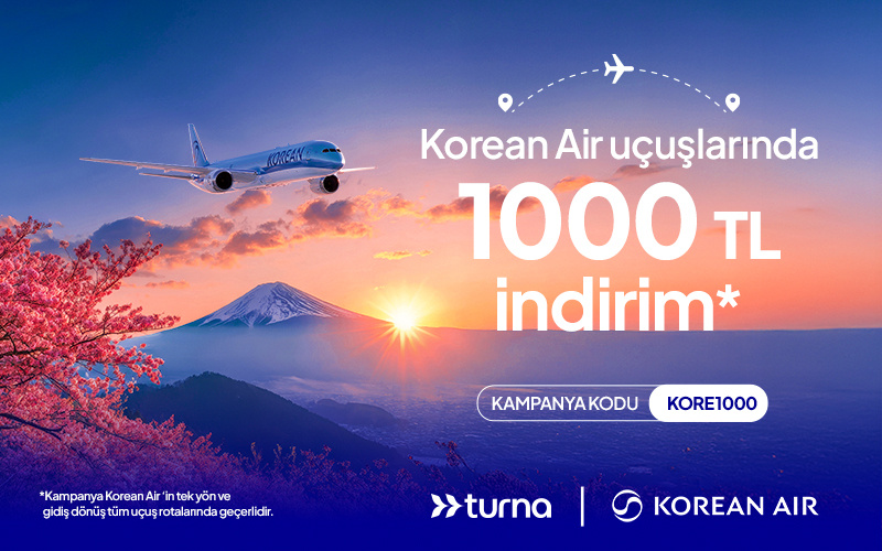 Korean Air uçuşlarında Turna’ya özel bu kampanyayla tüm Korean Air tek yön ya da gidiş dönüş biletlerinde anında 1000 TL indirim sizi bekliyor. Yapmanız gereken tek şey, biletinizi alırken KORE1000 kodunu girmek. Tarih konusunda da özgürsünüz; seyahatinizi dilediğiniz zamana planlayabilirsiniz. 31 Ocak’a kadar geçerli bu indirimle biletinizi şimdi Turna’dan alın, avantajlı fiyatlarla keşfetmenin tadını çıkarın.Korean Airlines uçak biletinizi hemen buradan alın!