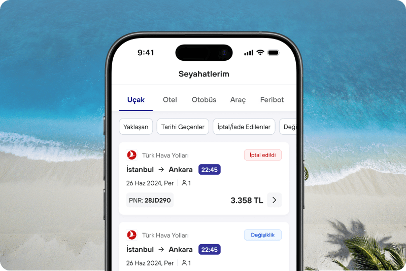 Turna’da her işin bir kolayı var. Uçak biletlerinde iptal ve değişiklik, otobüs bileti ve otel rezervasyonlarında ise online iptal hakkınız bulunuyor. Tüm iptal ve değişiklik işlemlerinizi web sitemizden ve uygulamamızdan kolayca yapabilirsiniz.